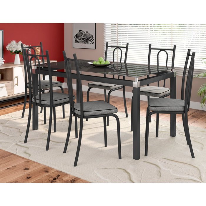 Conjunto De Mesa Tubular Malva Com 6 Cadeiras 123 Tampo De Vidro 140cm SF Preto Fosco Assento Platina Preto Artefamol