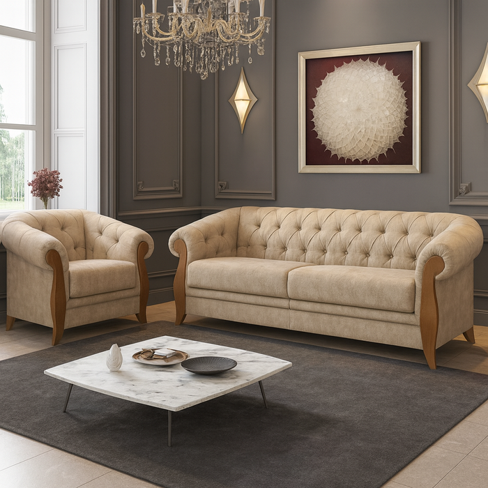 Conjunto Estofado 2 Lugares e Poltrona Capitonê Madeira Nobre Linho Bege Adhara Larbelle