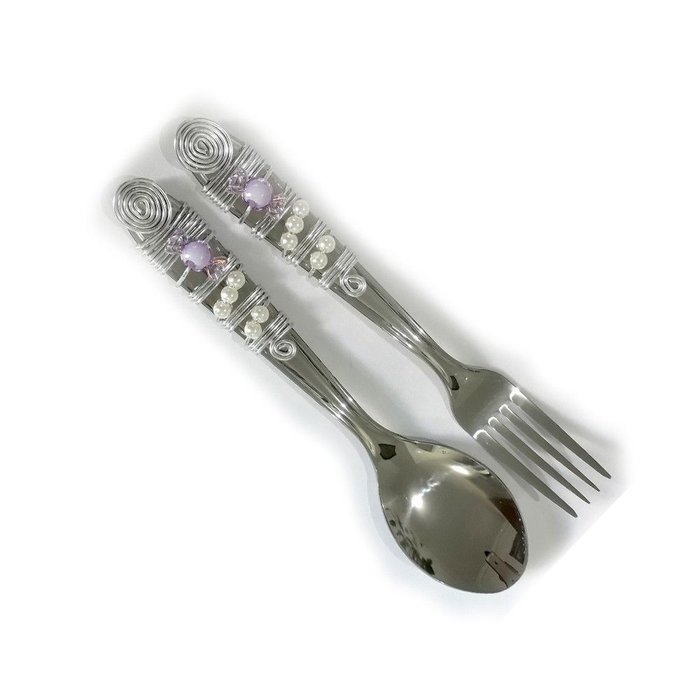 Charmoso Conjunto Garfo e Colher Infantil para estimular a criança quando inicia sua alimentação. Garfo e colher são inox, feito artesanalmente by Laris, seu cabo é bordado com fios de aço com perola resinada e pedra imitando balinha na cor lilás. Excelente opção de presente infantil!