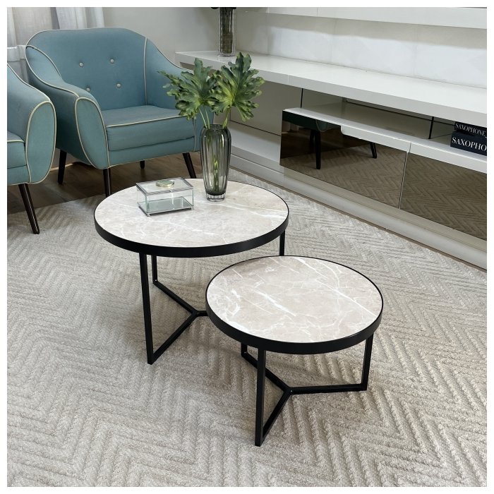 Conjunto Mesa de Centro Redonda Dallas Marmorizado Areia - Preto