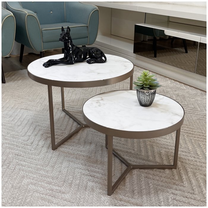Conjunto Mesa de Centro Redonda Dallas Marmorizado Branco - Champagne Marmorizado branco