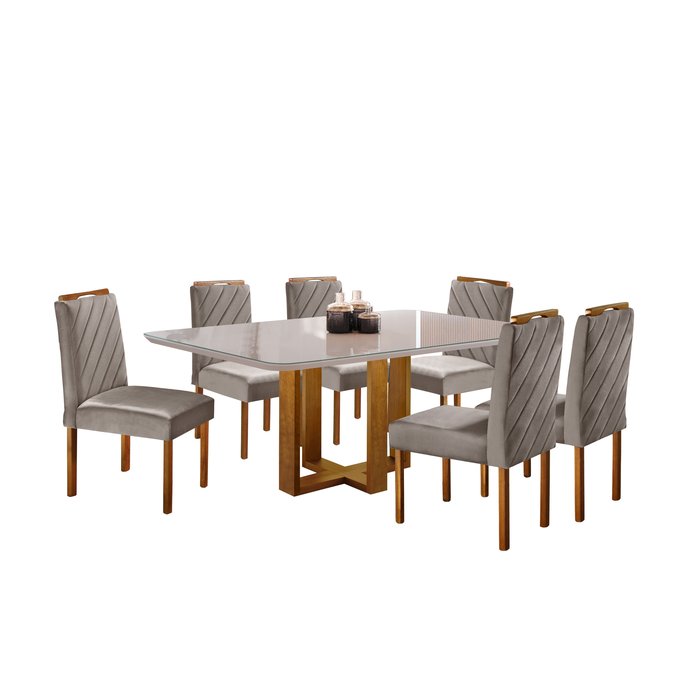 Acabamento: Resinado e Envernizado.Cor do Tampo: Off-White.Cor do Vidro: Off-White.Necessita Montagem: Sim, necessário montador.Embalagem Tampo: Perfil tubex, papelão e plástico bolha.Embalagem Base: Papelão e plástico bolha.A base é enviada separadamente, facilitando o transporte até o local desejado.Medidas MesaAltura aproximada: 78cm.Comprimento aproximado: 160cm.Largura (Profundidade): 90cm.Informações Técnicas CadeiraMaterial da Estrutura: Madeira Maciça de Eucaliptus Tratado, 100% Imunizado e Seco em Estufa.Assento: Espuma D26 Soft Real.Encosto: Espuma D18 Soft Real.Aplique no Encosto(Puxador): Sim.Assento/Pés: Reforçado.Tecido Cadeira: Veludo.Cor do Tecido: Marrom Acinzentado.Embalagem Cadeiras: Caixa de Papelão (duas cadeiras montadas por caixa).Medidas CadeiraAltura aproximada: 102cm.Comprimento aproximado: 47cm.Largura (Profundidade): 56cm.Capacidade em KG por Assento: Aproximadamente 150kg.Garantia: 3 meses contra defeito de fabricação (a contar da data do recebimento da mercadoria).Limpeza: Aspirar o produto para eliminar a poeira, utilizar um pano levemente umedecido.Recomendações: Usar em local seco, não molhar. Evitar exposição ao sol, para que o produto não sofra alterações na tonalidade e estrutura.ATENÇÃO!A tonalidade do produto pode variar entre a imagem de exibição e o item físico.Imagens meramente ilustrativas.Não nos responsabilizamos pela montagem/instalação dos produtos.- Os objetos que ambientam as fotos não acompanham o produto.- Verifique as dimensões do produto e certifique-se que o percurso que ele fará até o local de uso permite sua passagem. Nós não nos responsabilizamos por transporte de produtos, caso não caibam em elevadores, acima de três lances de escada e não cabendo na passagem das escadas, por içamentos ou desmontagens de produtos. Quaisquer despesas deste tipo ficam a cargo do cliente.- Anúncio sujeito a alteração sem aviso prévio.- Nossos produtos passam por um rigoroso controle de qualidade para que cheguem até o cliente em perfeitas condições, entretanto, em casos de desacordo com o proposto, o comprador deverá contatar o nosso SAC.- O prazo para solucionar os problemas identificados é de até 30 dias úteis, contados a partir da data do posicionamento do SAC com o comprador.