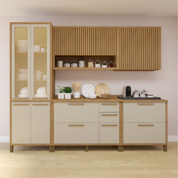 Estilo e elegância são as palavras certas para nosso conjunto de armários para cozinha. O destaque vai para o paneleiro com portas de vidro, que não só protege seus itens, mas também adiciona um toque de sofisticação à sua cozinha! Os armários aéreos com detalhes ripados dão aquele toque moderno. E para completar os móveis para cozinha espaçosa, o kit vem com dois balcões perfeitos para organizar tudo, oferecendo funcionalidade. Perfeito, não é mesmo?