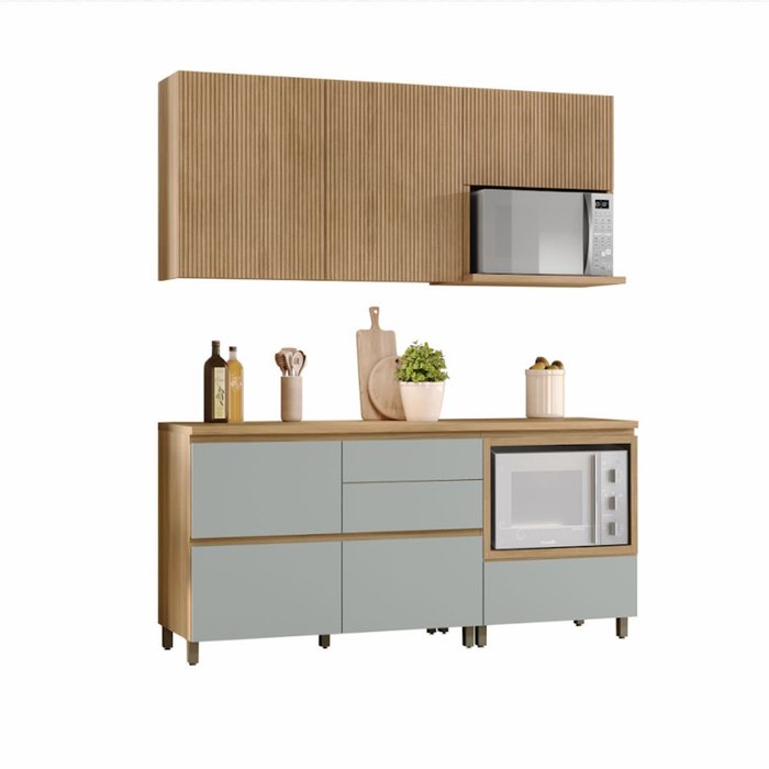 Os armários aéreos foram projetados com porta canelada, tendência de Milão - Itália, que propõe sofisticação, aconchego, grande beleza e harmonia ao conjunto.Outro grande diferencial são os balcões com maior altura útil do mercado, proporcionando maior espaço para guarda de utensílios e mantimentos e ainda com pés menores 10cm (mais regulagem de 2,5cm). O pé de 10 cm, deixa o conjunto com maior robustez, proporcionalidade e beleza.