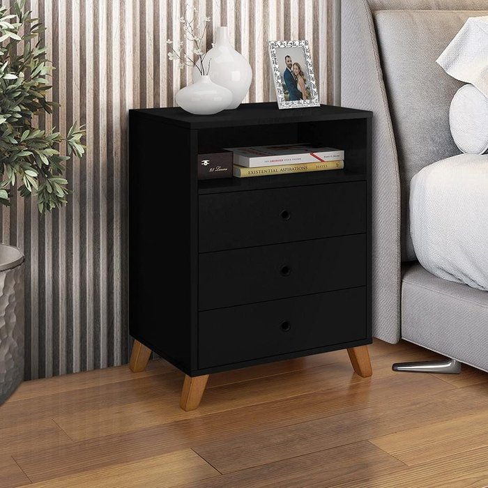Criado Mesa de Cabeceira 3 Gavetas e 1 Nicho Preto Preto