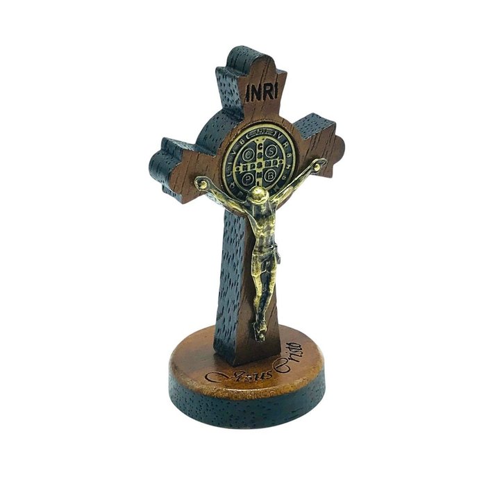 Crucifixo de Mesa Medalha de São Bento é produzido em madeira com o Cristo em metal ouro velho. Acompanha uma base removível para utilizar na mesa. Perfeito para ter em casa como símbolo de devoção à São Bento