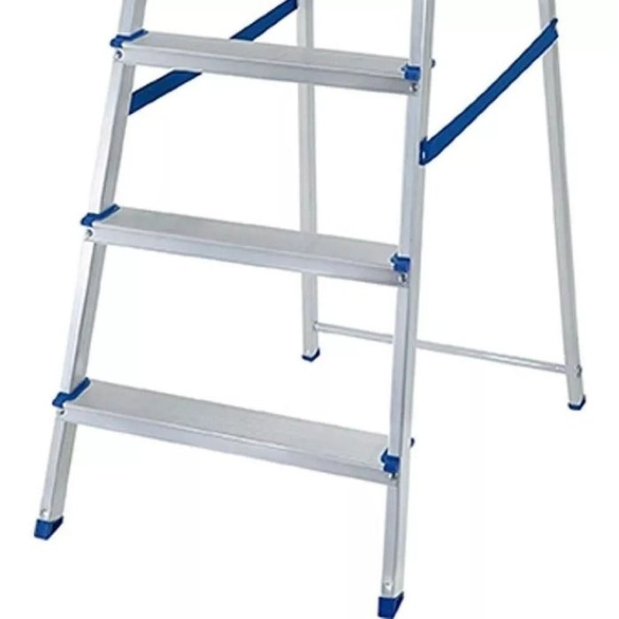 Com design dobrável e estrutura reforçada, a escada conta com 7 degraus amplos e antiderrapantes, oferecendo mais estabilidade e segurança durante o uso. Seu sistema de trava automática garante firmeza ao ser aberta, evitando fechamentos acidentais. As sapatas emborrachadas nas extremidades proporcionam maior aderência ao solo, mesmo em pisos lisos, prevenindo escorregões.