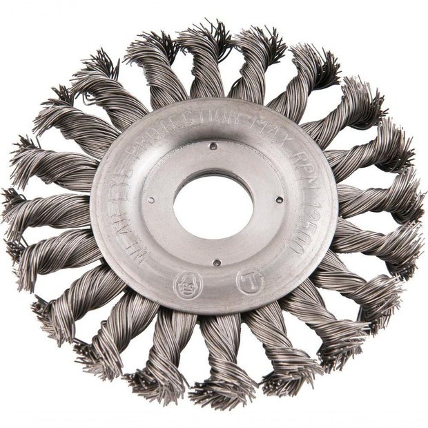 DETALHES TÉCNICOS Material/acabamento das cerdas da escova: Aço carbono/polido Tipo de cerdas da escova: Torcida Diâmetro externo da escova (pol): 4.1/2 " Espessura da escova (pol): 1/2 " Diâmetro do furo da escova (pol): 7/8 " Rotação máxima (rpm): 12500 rpmProduto: Escova