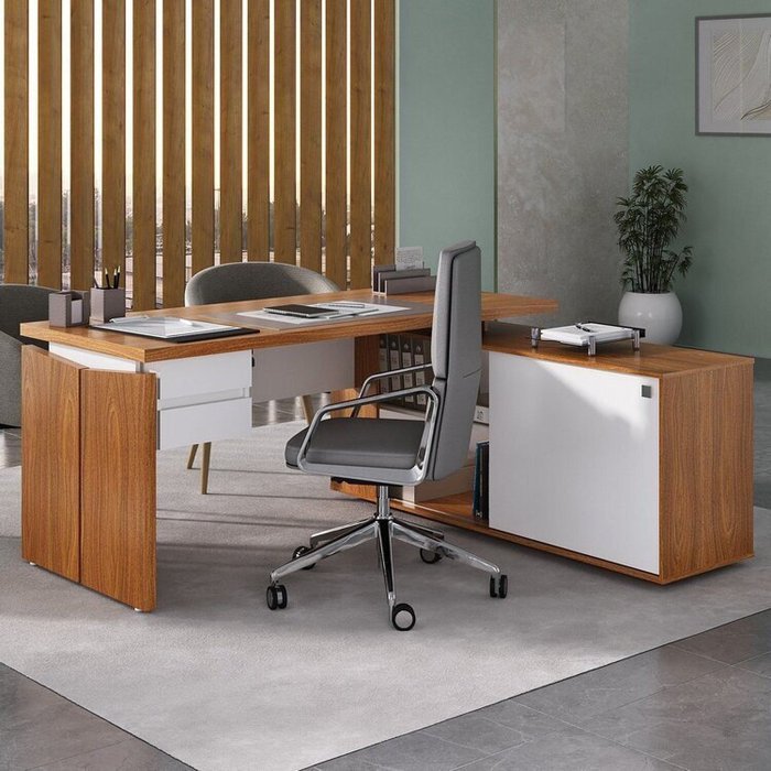 Escrivaninha Mesa Escritório em L Diretor com Armário e 2 Gavetas 170cm Freijó E Branco