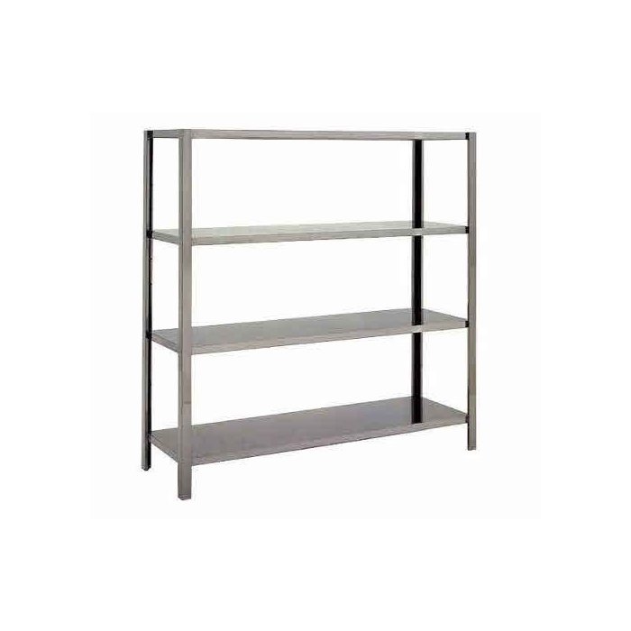 Estante aberta com 4 planos em aço inoxidável com estrutura em cantoneiras soldada, qua proporcionam maior resistência, planos lisos com dobras laterais de reforço isento de arestas ou cantos, com as seguintes características: