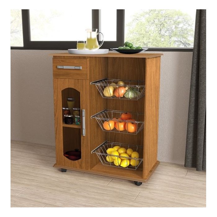 Gaveta ampla3 cestos fruteiros1 Porta com vidro frontal e 2 Nichos internosProduzido em MDPPintura UVPuxador clean cromadoRodízios