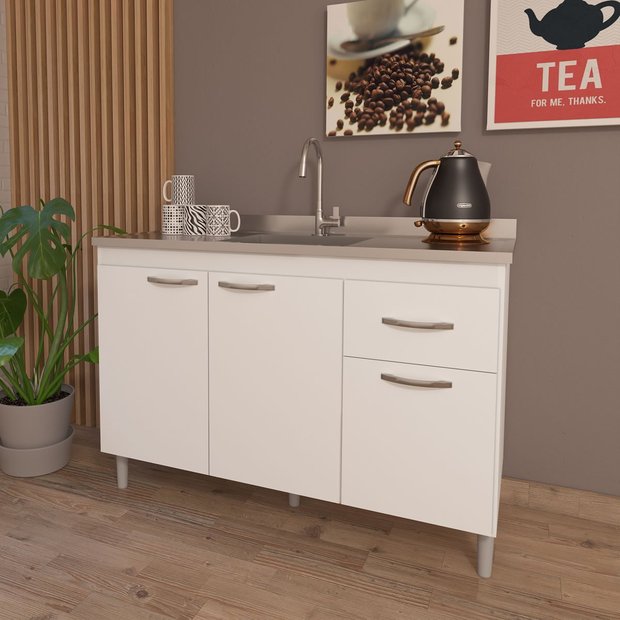 O Balcão POP para pia de 1,20m apresenta características decorativas e práticas. Com design compacto, se adapta bem aos ambientes, como cozinha, copa, espaço gourmet e área de serviço. O espaço interno, que vem com prateleiras e divisórias é ótimo para organização dos utensílios e mantimentos.