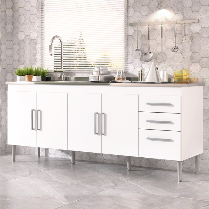 Este gabinete é produzido especialmente para pias de 2m, possui 3 gavetas com corrediças metálicas para melhor armazenar os itens de cozinha e conta com uma prateleira profunda completa no seu interior. Possui puxadores modernos e 6 pés para evitar empenamento da base, o gabinete é totalmente fabricado em MDP, aumentando a durabilidade, resistência e qualidade do produto. O gabinete NÃO ACOMPANHA o tampo da imagem. Além desses detalhes possui uma fácil montagem.