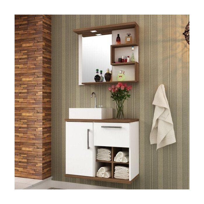 Gabinete para Banheiro 70cm com Cuba e Espelheira Veneza Branco/Nogal