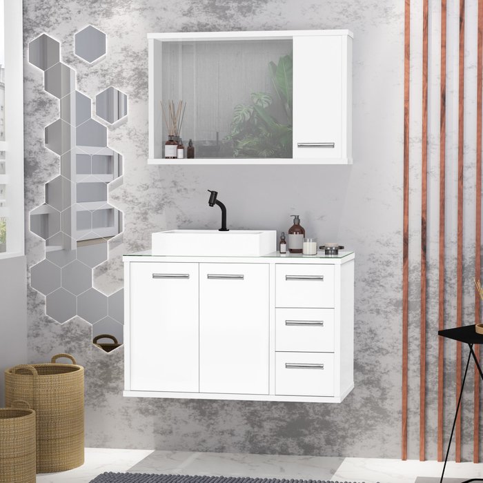 O Conjunto TURIN 80 cm C/ Tampo de Vidro é uma excelente opção para você que deseja renovar o seu banheiro.