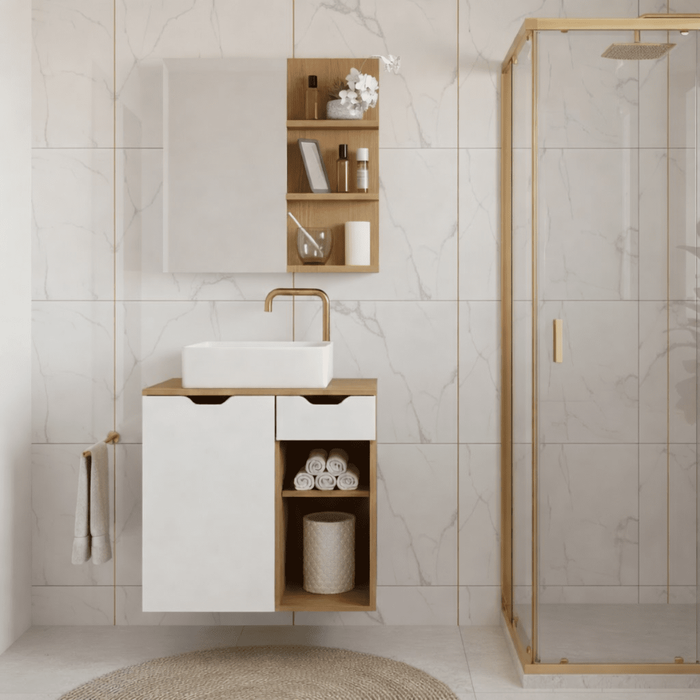 O Gabinete Prisma Ma entrega organização de verdade com um visual moderno. Ele combina porta, gaveta e nicho aberto, facilitando a rotina e deixando o banheiro mais funcional.