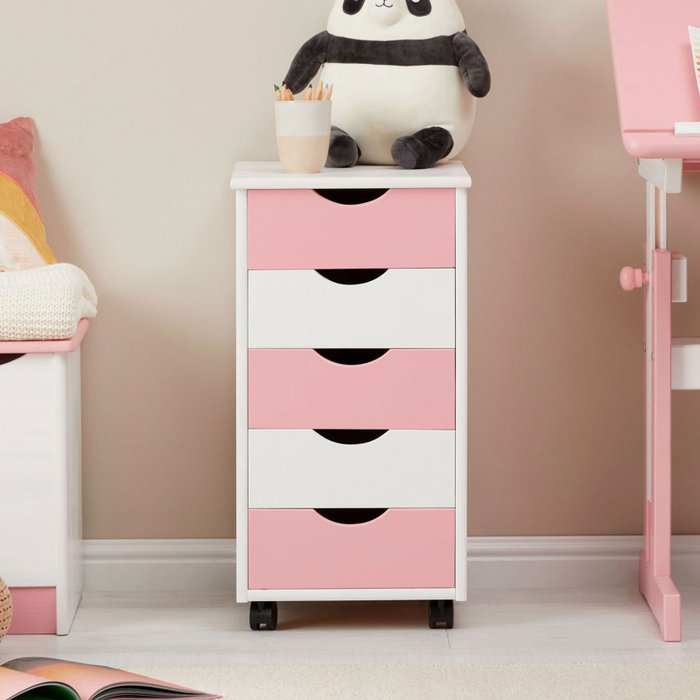 Gaveteiro Escritório Madeira Maciça 5 Gavetas Rodízios Lagos Branco Rosa Idimex