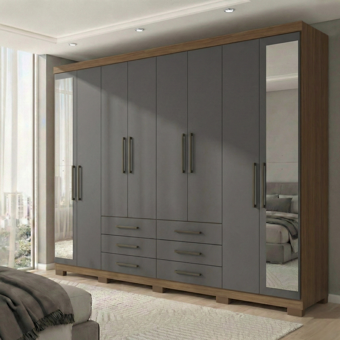 Guarda Roupa Casal com Espelho e Pés 8 Portas e 6 Gavetas Master Jatoba/Grafite