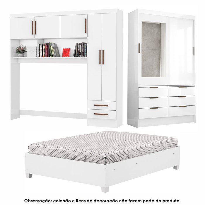 Guarda Roupa Casal Modulado Sevilha 5 e 2 Portas 8 Gavetas com Espelho e Cama Casal Carioca Móveis Branco