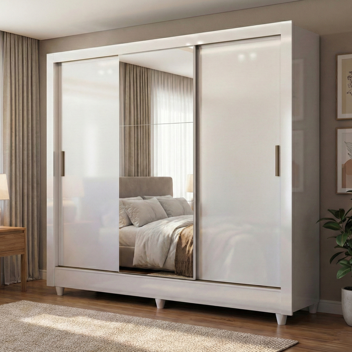 - Design Funcional com Espelho: Suas 3 portas de correr são perfeitas para otimizar o ambiente, pois não exigem área para abertura. A porta central com espelho integrado adiciona profundidade ao quarto e praticidade para o dia a dia.