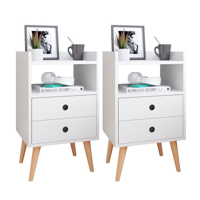 Jogo 2 Mesa de Cabeceira Kit Mesinha Canto Quarto Lateral Cama 2 Gavetas Organizadoras Retrô Quarto Branco