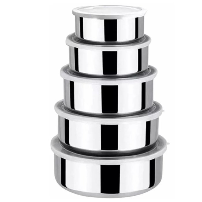Jogo 5 Potes Inox com Tampa Conjunto Marmita Vasilha Empilhavel Armazenamento Refeiçao Alimento Orga Cromado