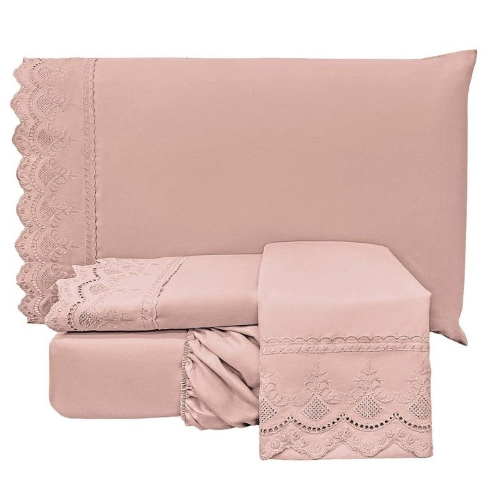 Jogo de Lençol Casal Bordado Inglês Lauren 3 Peças Rosê Rosê