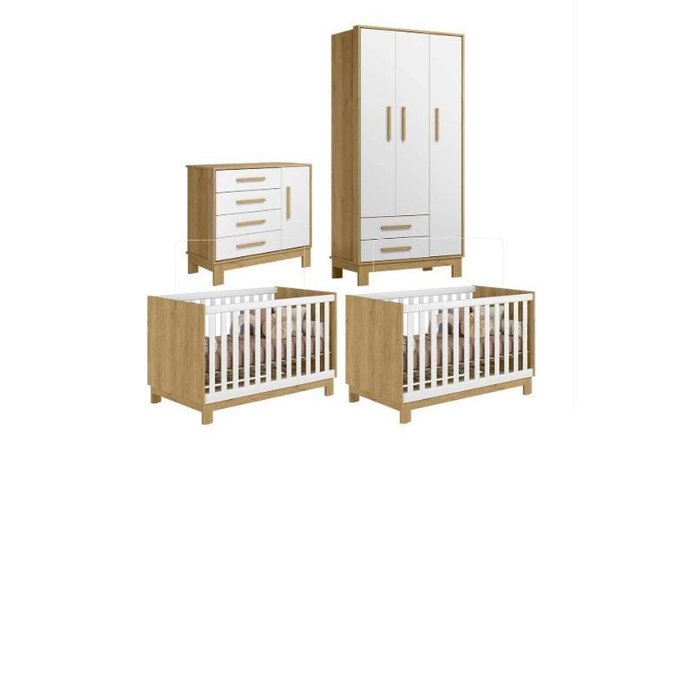 Jogo de Quarto Infantil Gemeos com Roupeiro Comoda e 2 Berço Branco Freijó