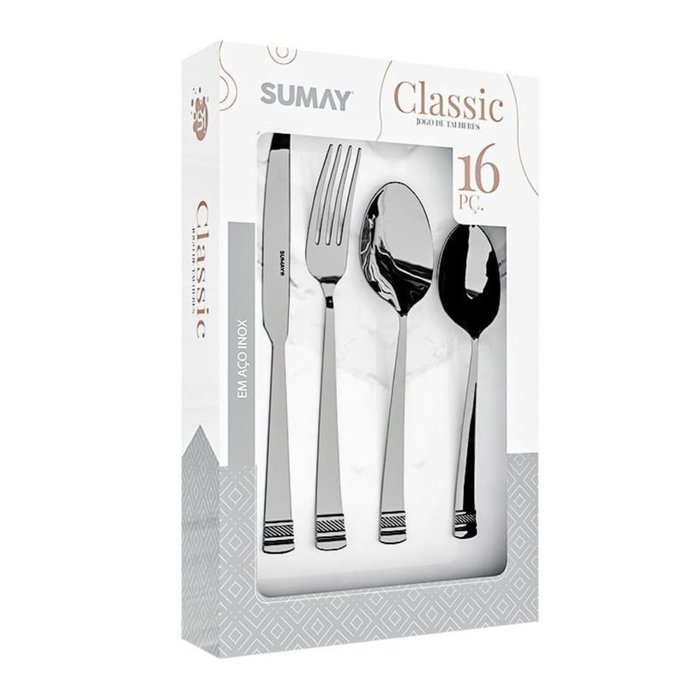 O Jogo de Talheres Classic 16 Peças da Sumay entrega elegância, resistência e sofisticação para o seu dia a dia. Fabricado em aço inoxidável de alta qualidade, é resistente à corrosão, não mancha, não enferruja e possui acabamento polido, trazendo brilho e requinte à mesa. Ideal tanto para uso diário quanto para ocasiões especiais, seu design clássico, durável e atemporal combina com qualquer estilo de cozinha ou decoração.