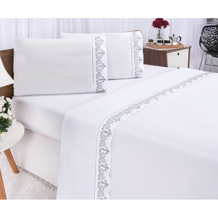 Jogo Lençol Casal King Percal Atenas Branco com Cinza 4 Pçs Branco com Cinza