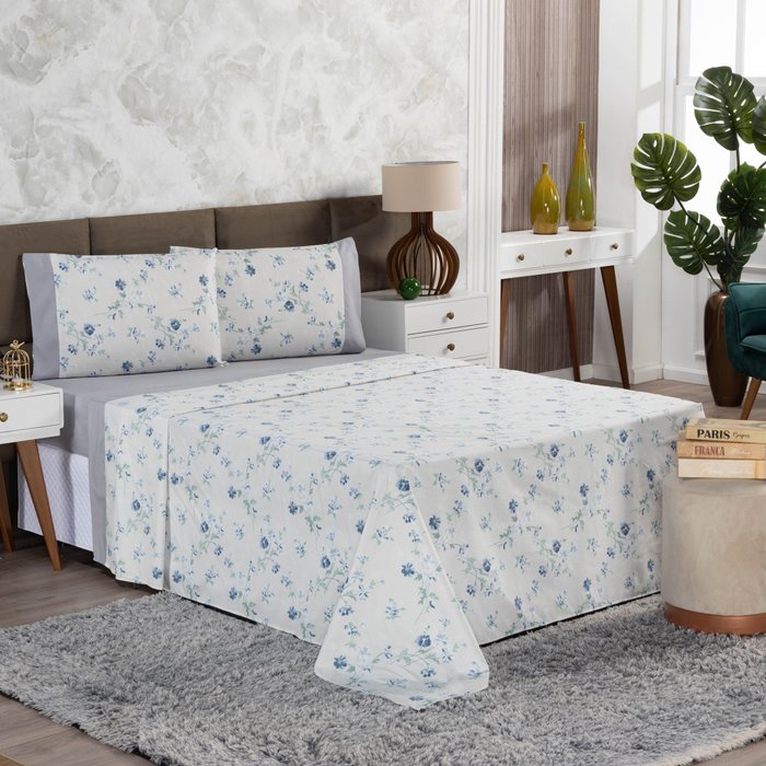 - Jogo composto por 1 Lençol com Elástico Liso, 1 Lençol de Cima Estampado e 2 Fronhas Estampadas;