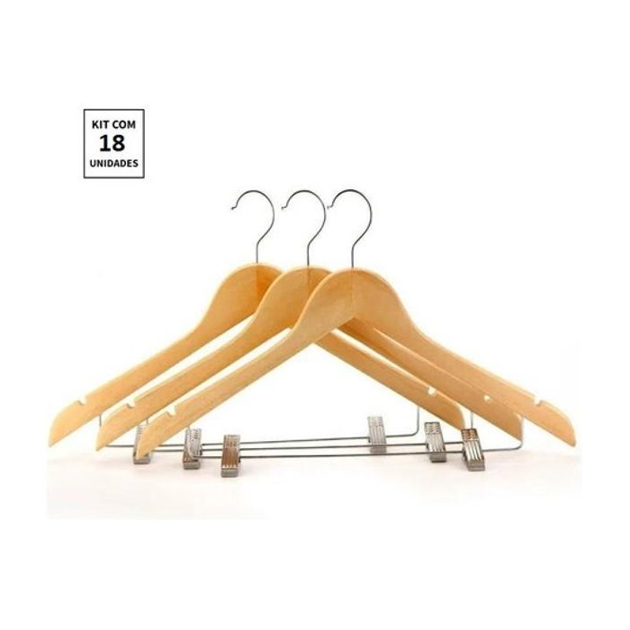 Cabide de Madeira com Gancho e Presilhas Cromadas - 18 unidades