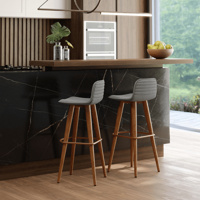 Design moderno, conforto e resistência para bancada, cozinha ou espaço gourmet. Assentos em linho e base em madeira maciça carvalho: elegantes, firmes e fáceis de montar.