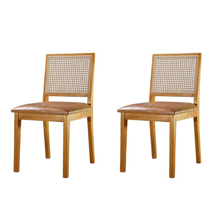 Kit 2 Cadeiras Atenas em Madeira Maciça, Courino Caramelo e Encosto Rattan Natural.