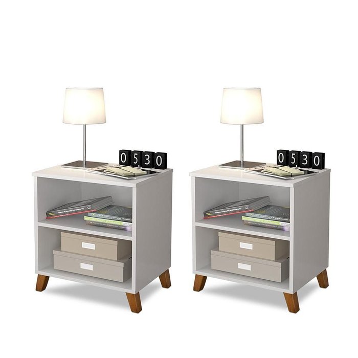 Kit 2 Criados de Cabeceira Retro Pes Palito 2 Nichos Branco Branco
