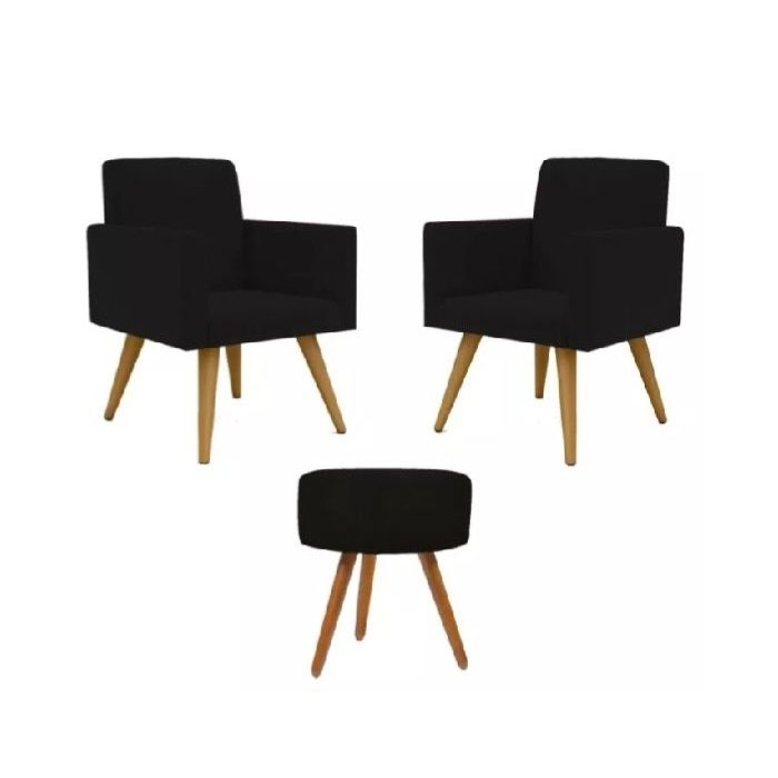 Kit 2 Poltronas Decorativa + Puff Talita Cor Preto Tecido Suede Salão,recepção ,escrtitório