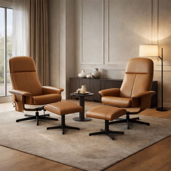 Kit 2 Poltronas Manuais Reclináveis Royale com Massagem Aquecimento Suporte para os Pés PU Caramelo