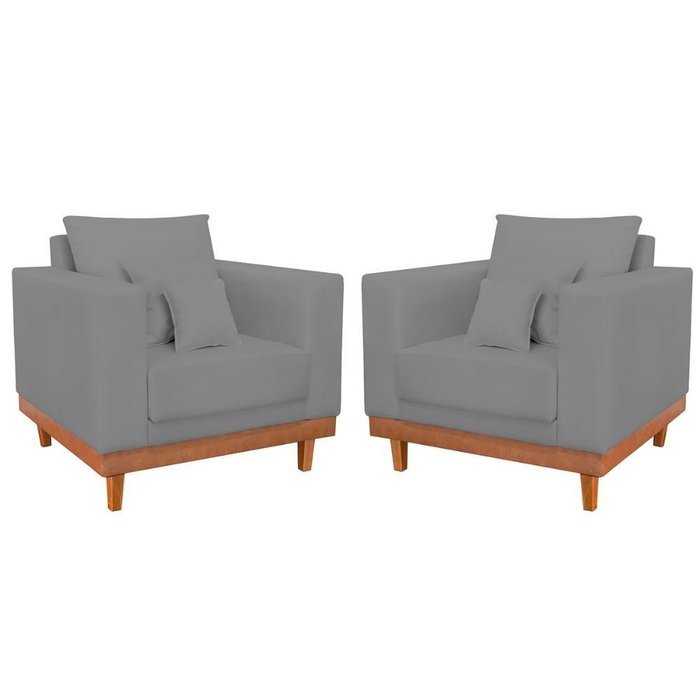 Kit 2 Poltronas Reforçada Linho Pés Base Madeira + Almofadas Cor:grafite