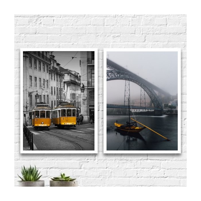 Kit 2 Quadros Portugal Amarelos 33x24cm:Madeira preta