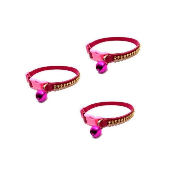 Kit 3 Coleiras De Couro Com Strass E Guizo Rosa