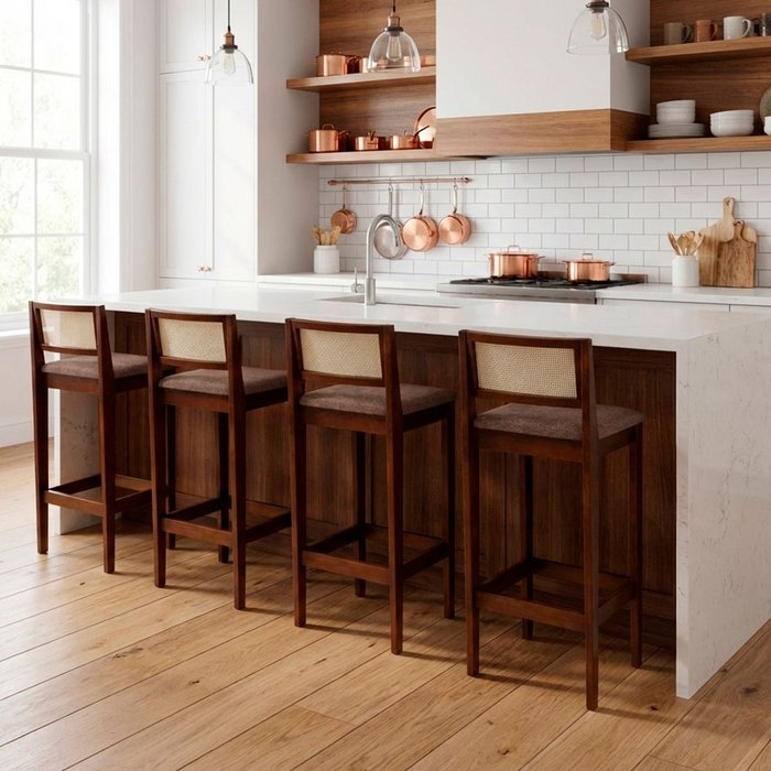 A Banqueta Alta Bruna combina elegância, conforto e resistência em um único design. Ideal para cozinhas, áreas gourmet e espaços modernos, ela traz um visual sofisticado graças ao seu encosto em tela palhinha bege, que adiciona leveza e charme natural ao ambiente.
