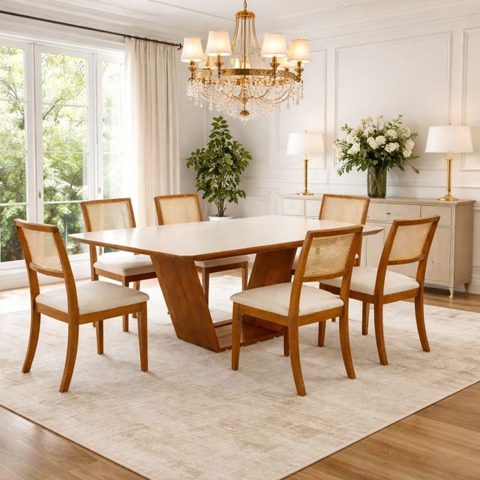 Kit 6 Cadeiras de Jantar Palha Estofadas Linho Bege com Tela Sextavada Rubi Madeira Maciça Mel Bege