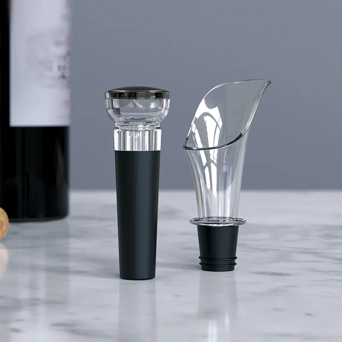 Utilize o Cortador de Cápsulas para realizar o corte de selo do seu vinho de forma simples e rápida. Feito isso, posicione o Abridor Automático sob a garrafa e aperte o botão de baixo para inserir a espiral na rolha em seguida pressione o botão de cima para que a rolha saia no abridor. O Aerador irá oxigenar seu vinho liberando e realçando seu aroma. Caso haja sobra na garrafa, basta tampa-la com a Bomba a Vácuo e bombear para que todo o oxigênio seja extraído da garrafa garantindo o sabor e prorrogando o consumo do seu vinho por mais tempo.