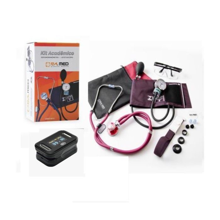 O kit é destinado para o uso acadêmico. Contém 01 Estetoscópio Rappaport, 01 Aparelho de Pressão, 01 Óculos de Proteção e 01 Garrote.