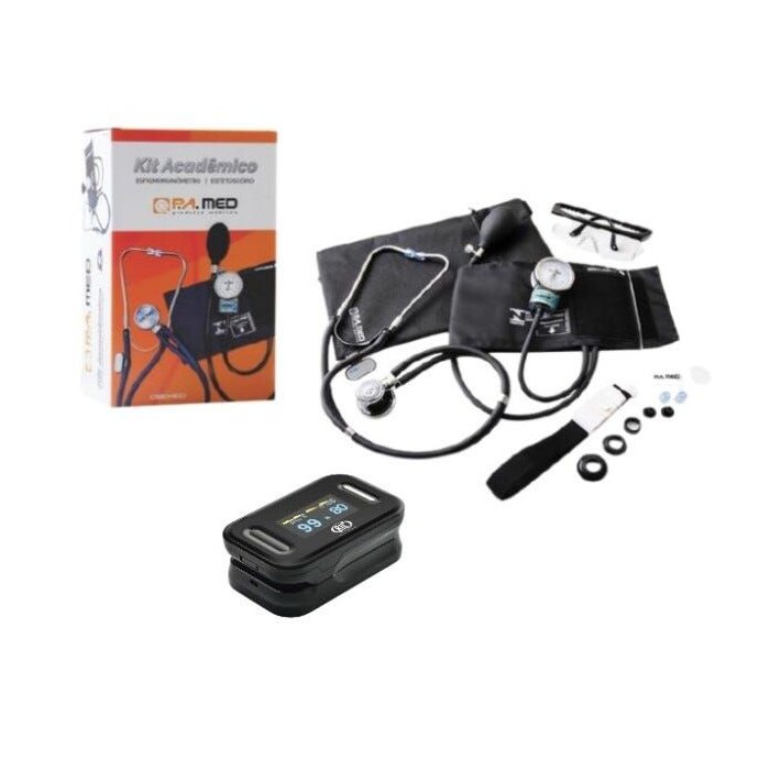 O kit é destinado para o uso acadêmico. Contém 01 Estetoscópio Rappaport, 01 Aparelho de Pressão, 01 Óculos de Proteção e 01 Garrote.