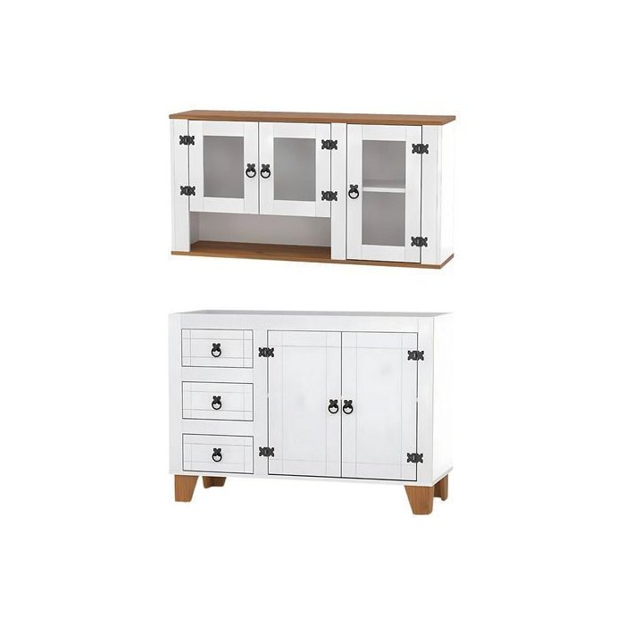 O kit Balcão para Pia 2 Portas e 3 Gavetas + Armário aéreo para pia 3 portas é produzido em madeira mista, combinando a robustez da madeira com a praticidade do MDF, criando um ambiente acolhedor e elegante. As portas e frentes de gavetas são produzidas em MDF para um acabamento mais sofisticado, com o corpo de Madeira Maciça (Pinus reflorestado) para dar resistência e durabilidade para o produto. Você terá espaço de sobra para organizar seus utensílios com estilo. Durabilidade garantida, feito para resistir ao uso diário, esse balcão é a escolha ideal para quem busca qualidade. Acabamento Balcão: Acabamento: Cera cor branco com veios e nós aparentes Pés: Cera cor carvalho Acabamento Aéreo: Acabamento: Cera cor branco com carvalho com veios e nós aparentes Material do Puxador das Portas e Gavetas: Puxador de metal Complexidade da Montagem: Baixa: Pode ser montado por uma pessoa sozinha Medidas Balcão: Altura: 85cm Largura: 120cm Profundidade: 48cm Medidas Aéreo: Altura: 62cm Largura: 120cm Profundidade: 30cm Necessita Montagem: Sim Itens Inclusos : 1 Balcão para Pia 2 Portas e 3 Gavetas + Aéreo para Pia 3 Portas e Manual de Montagem