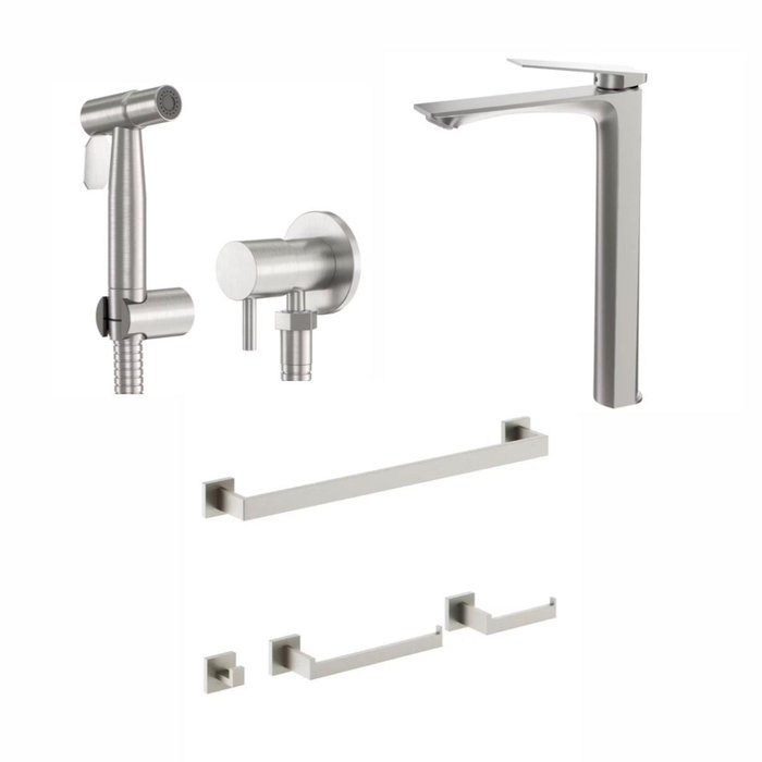 Kit Banheiro Prata Escovado: Torneira Atenas Alta, Ducha Higiênica e Acessórios 4 Peças