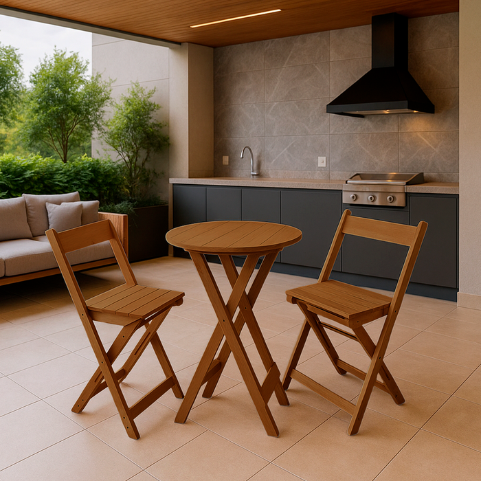 O que acompanha:1 - Mesa bistrô dobrável de Madeira maciça 100% eucalipto 2 -Banquetas dobráveis de Madeira maciça 100% eucalipto
