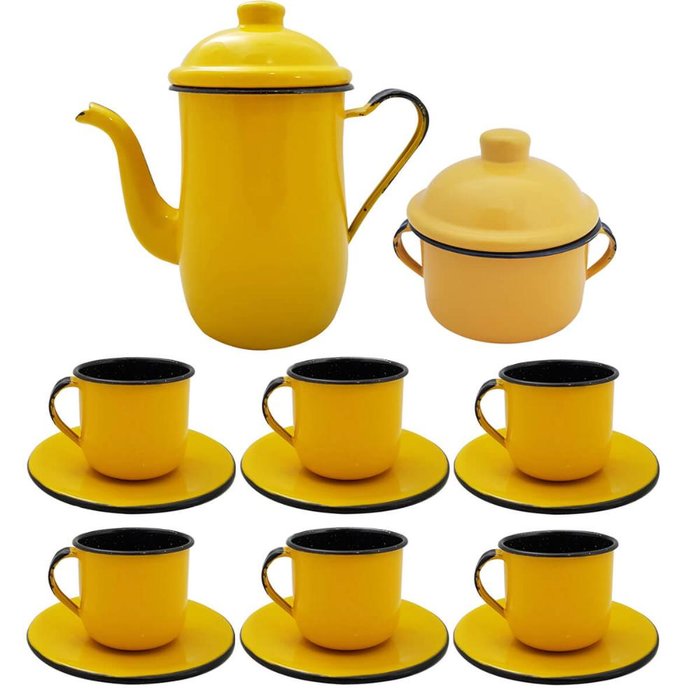 Kit Bule Café Chá com 6 Xícaras Pires Açucareiro Aço Esmaltado Amarelo Amarelo