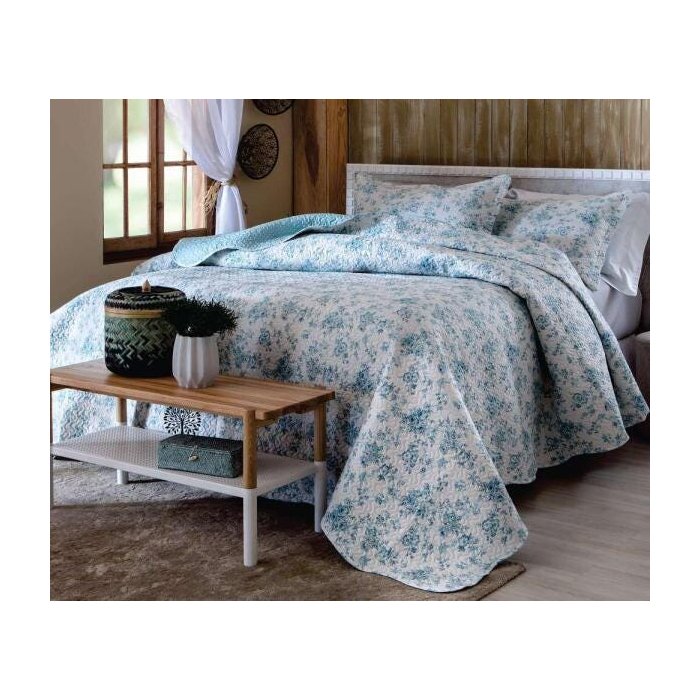 Kit Colcha Bouti Shabby Chic Floral Azul Poá Casal